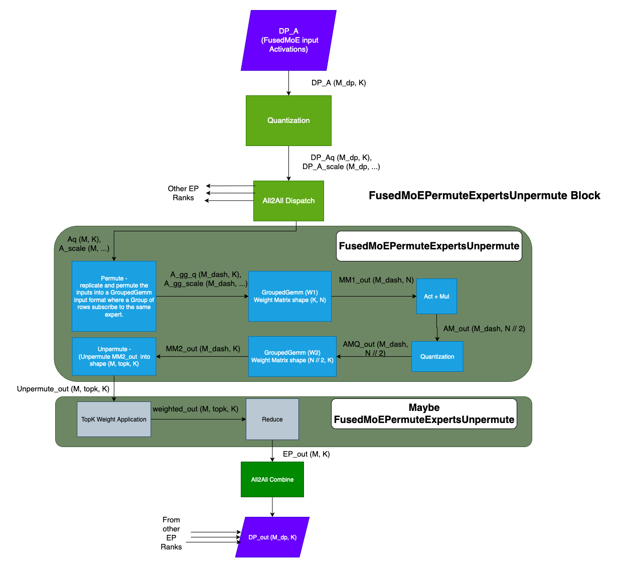 As can be seen from the diagrams, there are a lot of operations and there can be a variety of implementations for each operation. The set of ways the operations can be put together to make a valid FusedMoE implementation quickly becomes intractable. The Modular Kernel framework addresses this issue, by grouping the operations into logical components. This broad categorization makes the combinations manageable and prevents code-duplication. This also decouples the All2All Dispatch & Combine implementations from the FusedMoE implementations and allows for their independent development and testing. Furthermore, the Modular Kernel framework introduces Abstract classes for the different components thus providing a well-defined skeleton for future implementations.